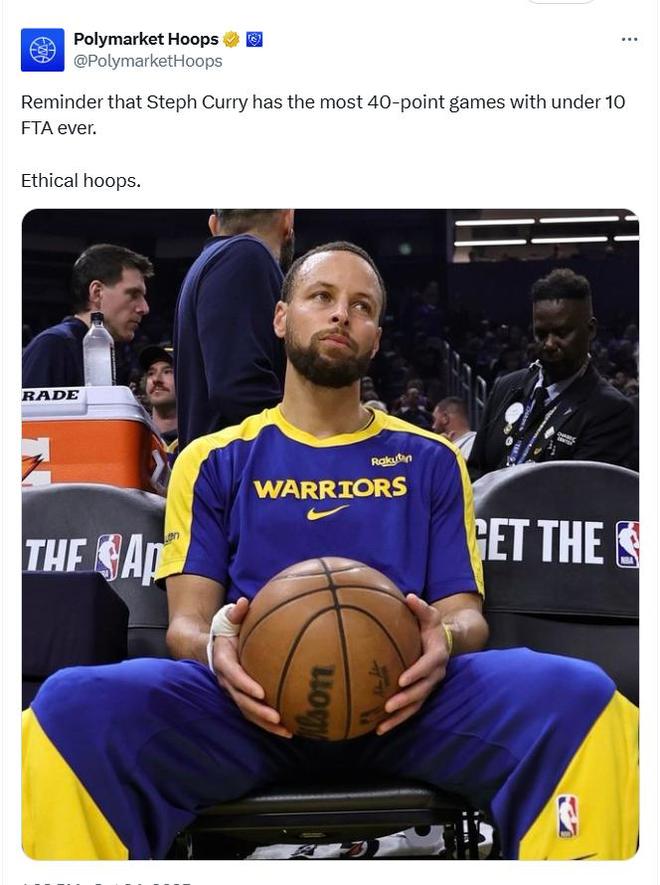 此外,库里还创下了2大NBA历史第1神迹。第1、根据美媒Ploymarket Hoops报道:斯蒂芬-库里是史上砍下40+且罚球不超10次场数最多的球员(共计51次)。乔丹47次排名第2,詹姆斯25次排名第6。