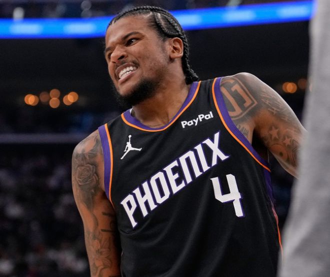 太阳新援杰伦-格林复出第二场比赛,首节登场6分47秒疑似右腿筋拉伤,被搀扶离场伤退。